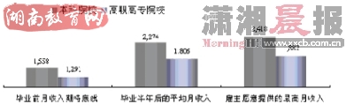 《2009年湖南省大学毕业生就业报告》显示,湖南省2008届本科毕业生毕业半年后平均月收入为2274元、高职高专为1806元;而2007届分别为2649元、1875元,2008届本科毕业生收入较上届下降了14%,下降较为明显,高职高专毕业生略有下降。湖南省2008届本科毕业生毕业半年后平均月收入最高的专业大类为工学类(2359元),最低为医学类(1945元)。