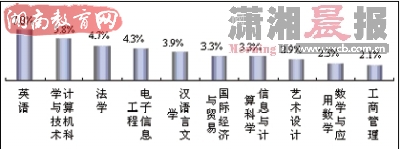 湖南省2008届本科毕业生毕业半年后失业人数最多的10个专业失业人数占了本科失业量的39.6%,其中有7个专业同时也是2007届失业人数最多的专业:英语、计算机科学与技术、法学、电子信息工程、汉语言文学、国际经济与贸易、信息与计算科学。湖南省2008届高职高专毕业生毕业半年后失业量最多的10个专业占了高职高专失业量的46.4%,其中有3个专业同时也是2007届失业最多的专业:模具设计与制造、计算机应用技术、商务英语。