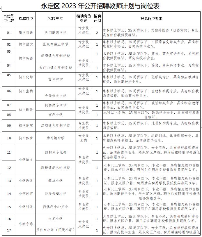 永定区教育系统2023年22个事业单位27个岗位计划面向社会公开招聘高中、初中、小学教师及幼儿园教师27名,其中,11个事业单位11个岗位计划用于专项招聘高校毕业生(高校毕业生指2021、2022、2023届未落实工作单位的毕业生,以下简称"高校毕业生")。各单位招聘岗位、招聘计划、报考岗位要求等详见《永定区2023年公开招聘教师计划与岗位表》,本次招聘所设专业不区分专硕和学硕,报考岗位要求中"以上""以下"均包括本层次要求。