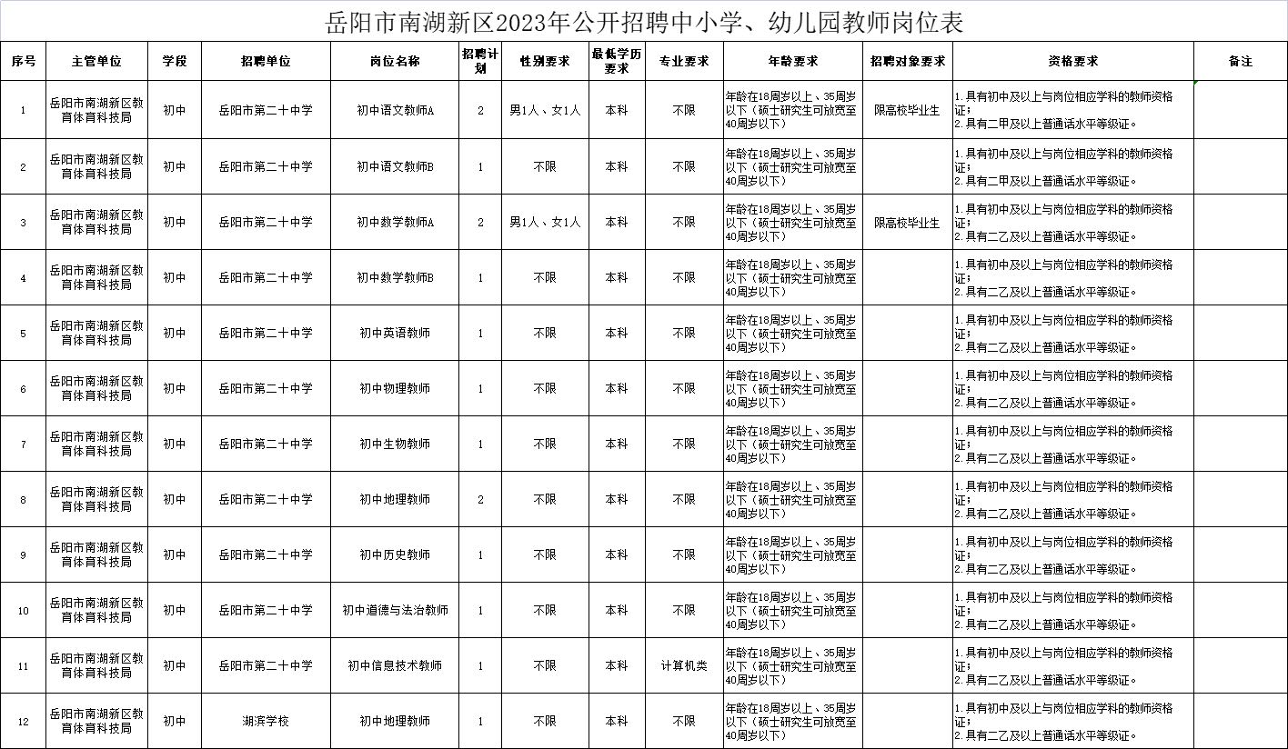 今年岳阳南湖新区计划招聘15名初中教师,招聘初中语文教师,初中英语教师,初中数学教师,初中生物老师,初中地理老师等其他学科教师,每个岗位要求不同,具体的详细的岗位招聘要求可以看下列表格,7月13日开始报名!