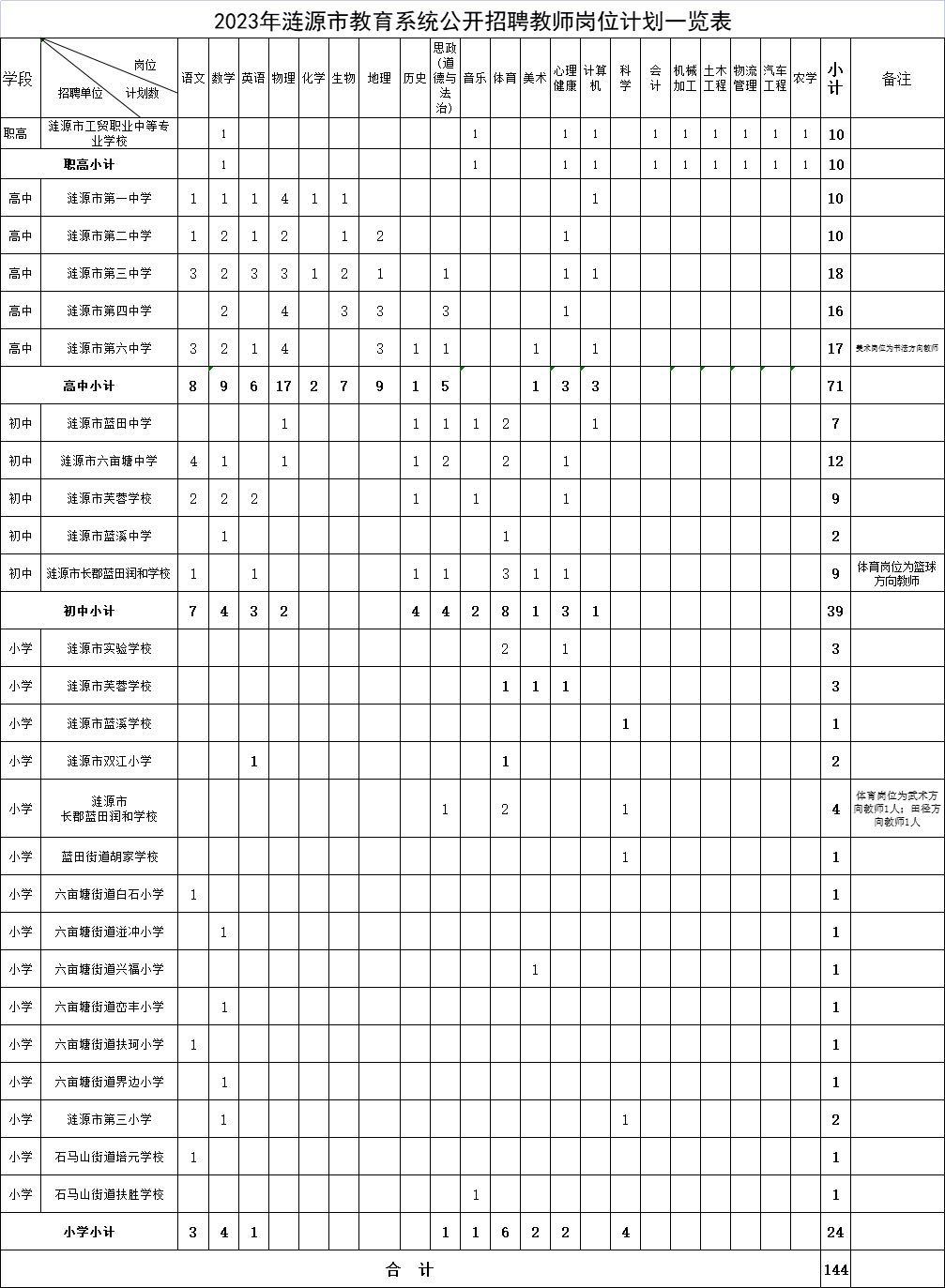 娄底涟源市今年已经发布了公开招聘教师的公告,招144名中小学教师,招聘要求全日制本科及以上学历,必须是全日制学历,自考或者成考不认可,具体的招聘岗位和招聘要求可以见下列表格!