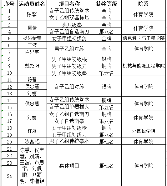 学校及院系领导高度重视学校武术队发展,在领队刘飞舟和教练员罗跃平、杨思佳老师的组织和带领下,选拔了来自体育学院、机械与能源工程学院、信息科学与工程学院、外国语学院等多个学院的6男6女共12名运动员参加比赛。自暑假伊始,武术队坚持每日进行高强度的技能训练,队员们展现出刻苦训练、追求卓越的精神风貌,面对困难与挑战,他们毫不退缩,勇于担当。经过赛场上激烈角逐,共获得了5金2银4铜的佳绩,金牌数排名全省参赛学校第八。