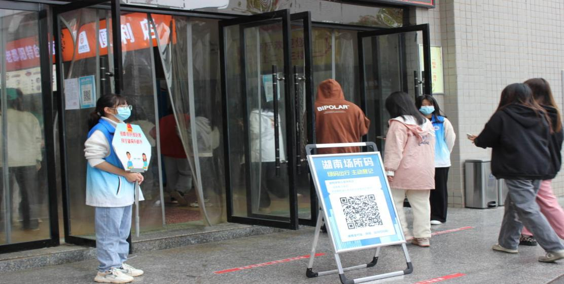 (体育学院志愿者在学校食堂门口执勤,检查健康码)