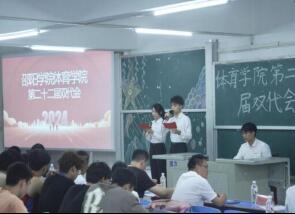 凝心铸魂担使命,奋楫扬帆新征程。为进一步加强学院团学组织建设,夯实团学工作基础,提升团学工作成效,体育学院于2024年5月26日14:00在明德楼南栋T3教室举行体育学院第二十二届团总支学生会代表大会,总结梳理工作,凝聚奋进力量。体育学院院长陈日升、体育学院党总支副书记副院长姜俊、全体辅导员、校学生会团委干部、全体学生代表及候选人参加本次大会。大会由22级体育教育一班丁天乐和23级体育教育二班何映彤主持。
