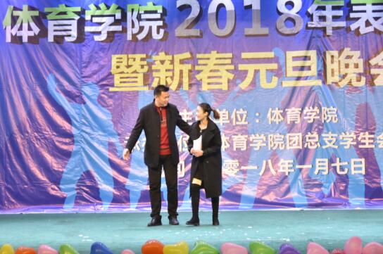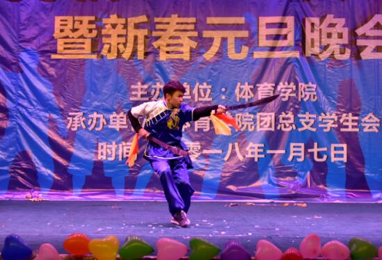 本次元旦晚会有13个精彩节目。其中穿插了奖学金颁奖仪式和“龙虎杯”三大球颁奖仪式。我们感受到了体育学院学生的风采,同时感叹他们台上一分钟,台下十年功的辛苦,给我们学院的师弟学师妹们树立了好榜样,最重要的是激励自己向榜样看齐。各种火热的舞蹈,捧腹大笑的小品,各班级的精心准备,以及默默在幕后奉献的工作人员,同学们之间完美的配合使得晚会圆满成功,每个精彩的节目背后都包含了深层的含义,我们感受到了相亲相爱的融洽情感,体味到青春永不散场的激情似火,让台下的观众从我们的节目中获益匪浅,回味无穷。